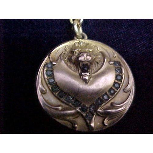 1" Round Locket with Red and Clear Rhinestones, Lion Face and Gold tone chain. We assume these are rhinestones but small stones confuse us! Opens to two sided locket. Chain about 17" long-or should we say short. Rather thick, nothing special. Does not hook on chain correctly. Could really stand a lot of cleaning.