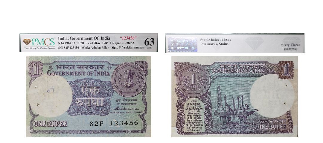 1 Rupee, 1986, Ladder Number, Inset A, Signed by S. Venkitaramanan, Serial: 82F 123456, Graded 63 UNC by PMCS, Staple hole at issue, pen marks, stains.Very rare.