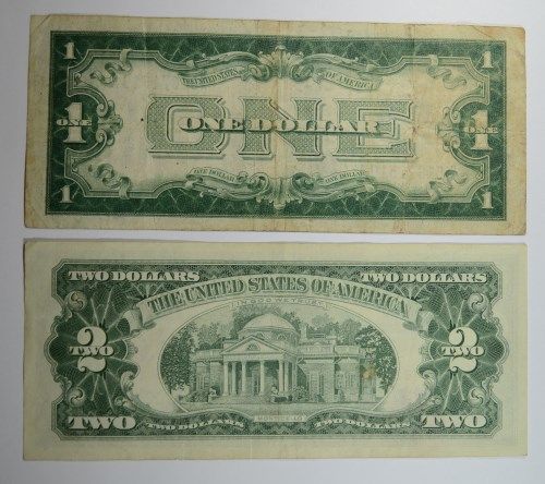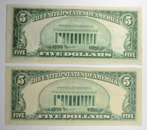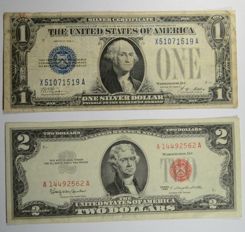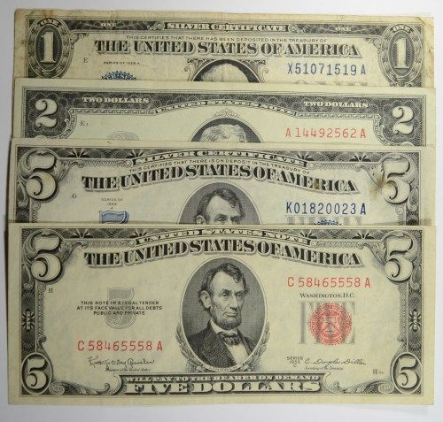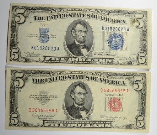 $1 SILVER CERT FUNNY BACK., $5 SILVER CERT., $5 RED SEAL, & $2 RED SEAL
