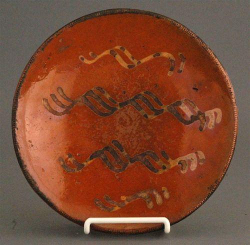 1 SLIP DECORATED REDWARE PIE PLATE, with crimped edge, 9" diameter, packing and shipping $30