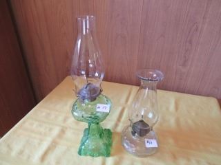 1 - SQUARE GREEN DEPRESSION GLASS STYLE BASE & CHIMNEY & 1 CLEAR GLASS FINGER LAMP & CHIMNEY