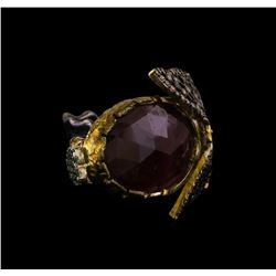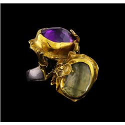 One of a kind high fashion sterling silver Ring weighing 28.7 grams. Black Antique texture. Containing: Amethyst, Green Quartz. This sterling silver p