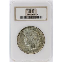 One 1922 NGC MS64 Peace Silver Dollar. NGC Certified.
