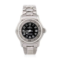 One ladies Ebel Discovery E6187531 Wristwatch featuring: Stainless steel case with a stainless steel bracelet. Uni-directional rotating bezel. Black d