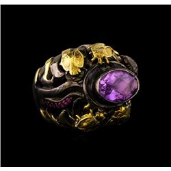 One of a kind high fashion sterling silver Ring weighing 18.5 grams. Black Antique texture. Containing: Amethyst, Synthetic Ruby. This sterling silver