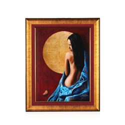 A Drifting Memory: A golden feather symbolically floats to the ground , as the beautiful subject of this limited edition giclee on canvas turns her a