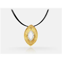 14K two tone gold textured shield necklace on a synthetic rubber neck chain set with 0.15 cts of G-H color SI2 clarity round brilliant diamonds.