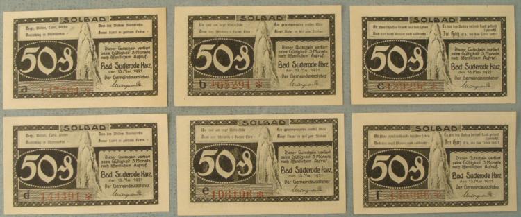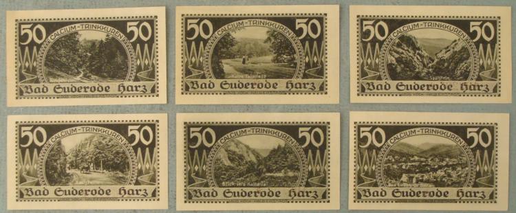 1 Set of 6 Different German Solbad 50 Pfennig notes, with different countryside scenes * Date: March 13, 1921Condition: Crisp Uncirculated