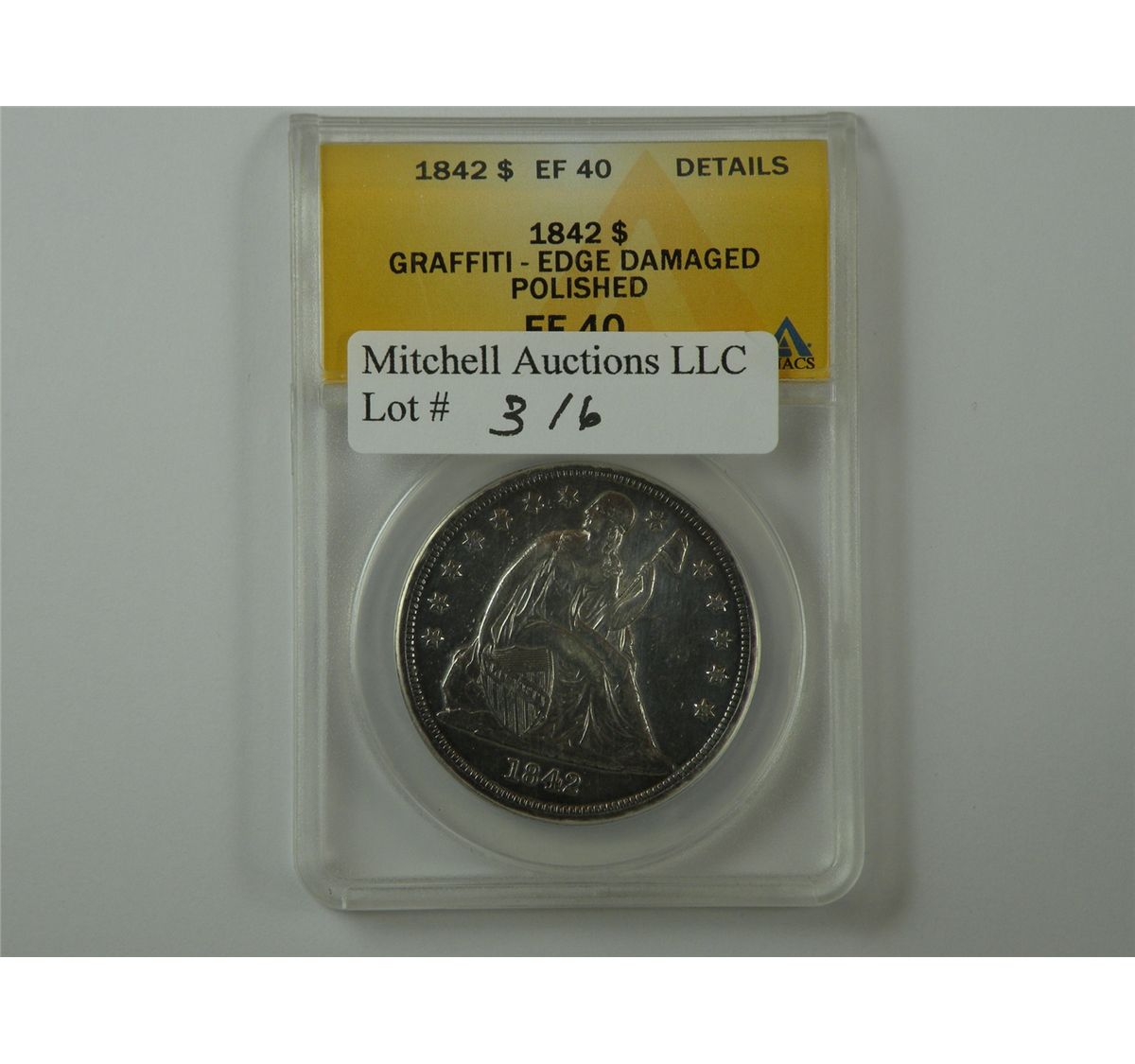 $1 Silver 1842 ANACS EF40 Details, Graffiti- Edge Damaged- Polished. The edge appears to have been spooned, and the graffiti is located in the right obverse field. Scarce nonetheless. Est.$225