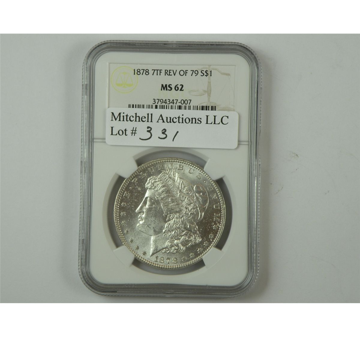 $1 Silver 1878 7TF Reverse of '79. NGC MS62. The strike is sharp, however the surfaces are just a bit rougher than the prior lot. Est.$110