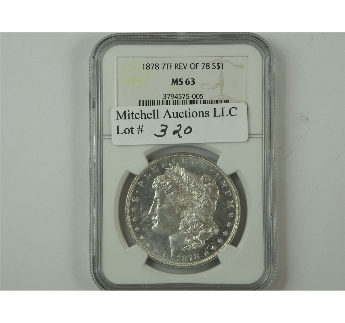 $1 Silver 1878 8TF. NGC MS63. Semi-prooflike fields exhibit a shallow scuff at the left obverse otherwise a higher grading would be warranted. Est.$185
