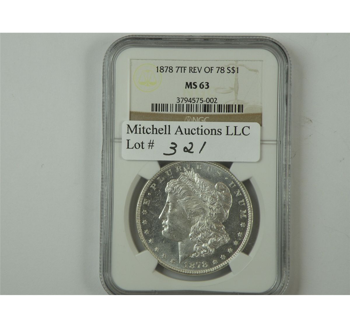 $1 Silver 1878 8TF. NGC MS63. Hints of reflectivity embellish this assertive, wholly lustrous coin. Est.$185