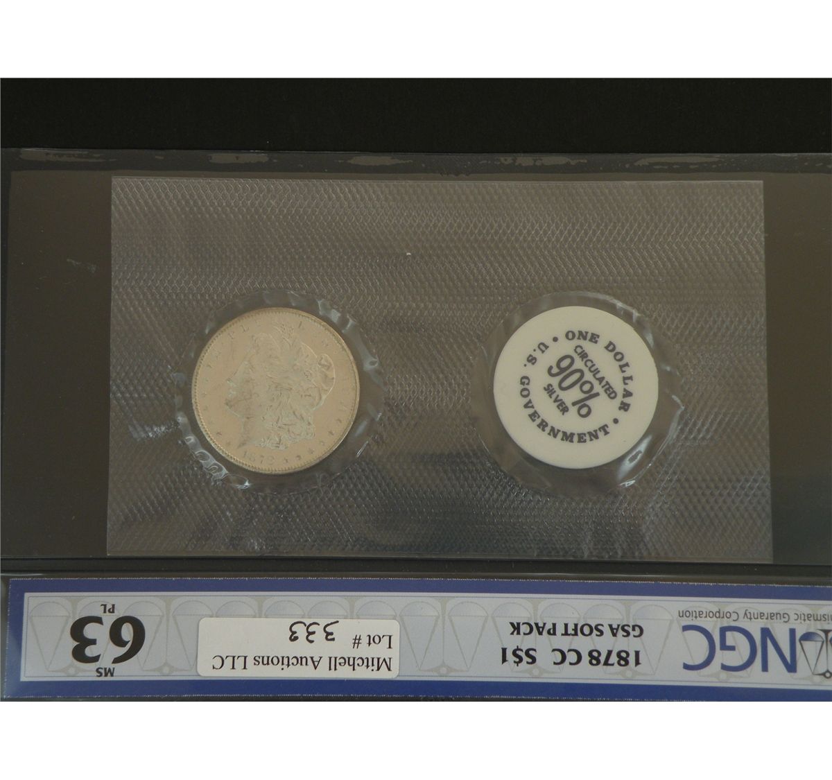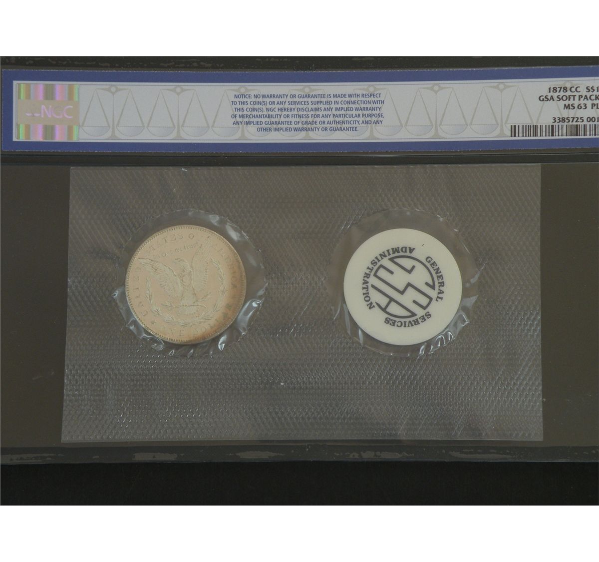 $1 Silver 1878-CC VAM-11. Die gouges on reverse wings. NGC MS63 PL, GSA soft pack. This specimen offers a bold strike and icy- reflectivity in the fields. Very elusive and worthy of a premium in this soft- pack GSA format. Est.$400