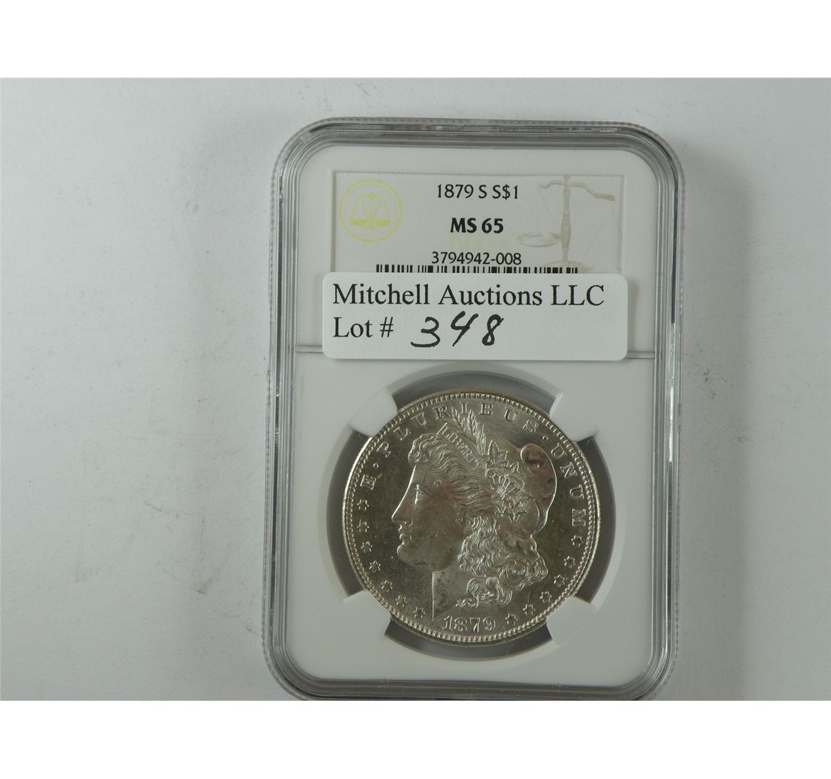 $1 Silver 1879-S NGC MS65. Chisel- sharp, boldly lustrous, and entirely satisfying. Est.$125