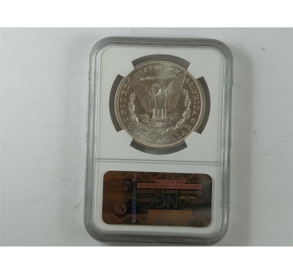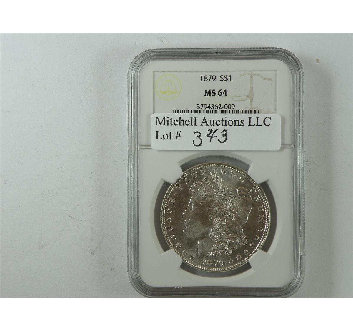$1 Silver 1879 NGC MS64 and a top flight "crack out" candidate. Wonderfully free of imperfections for the assigned grade, and awash in glowing satiny- silk mint lustre. Est.$150