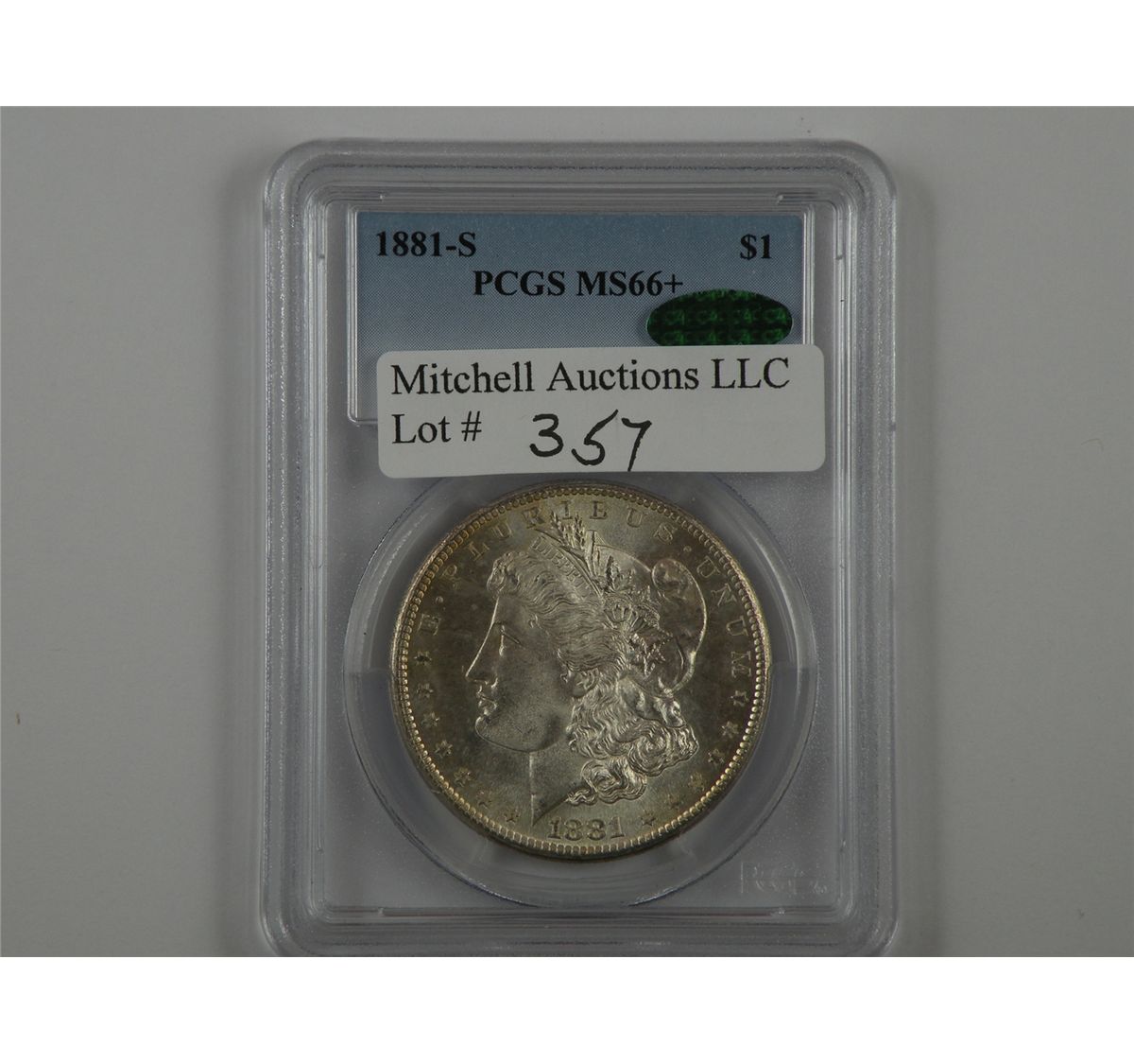 $1 Silver 1881-S PCGS MS66+ CAC. This handsome coin offers needle sharp design elements and satiny cartwheel bloom beneath wispy golden toning. Est.$385