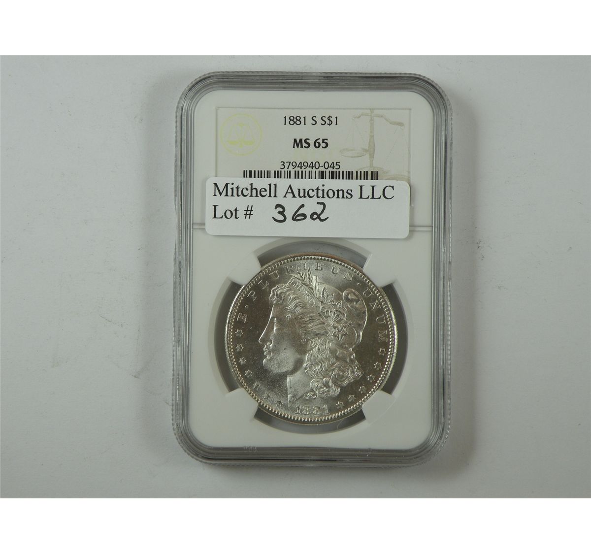 $1 Silver 1881-S NGC MS65 and another conservatively graded solid "crack- out" candidate. Bold, smooth, and very appealing. Est.$135