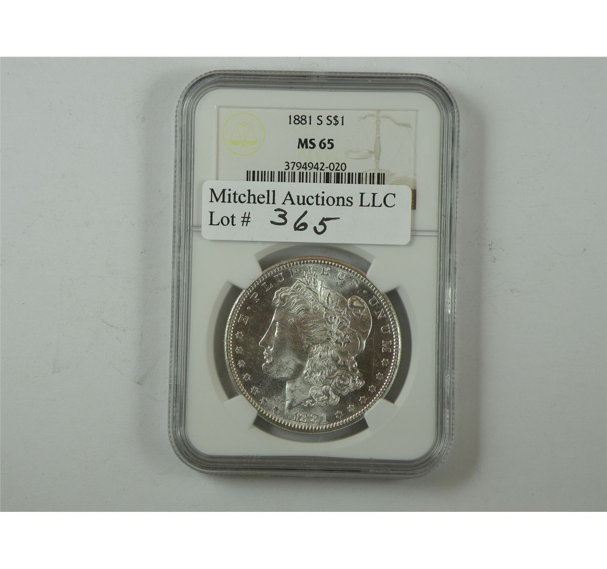 $1 Silver 1881-S NGC MS65. Well struck and enjoying a full measure of cartwheel vibrance. Est.$125