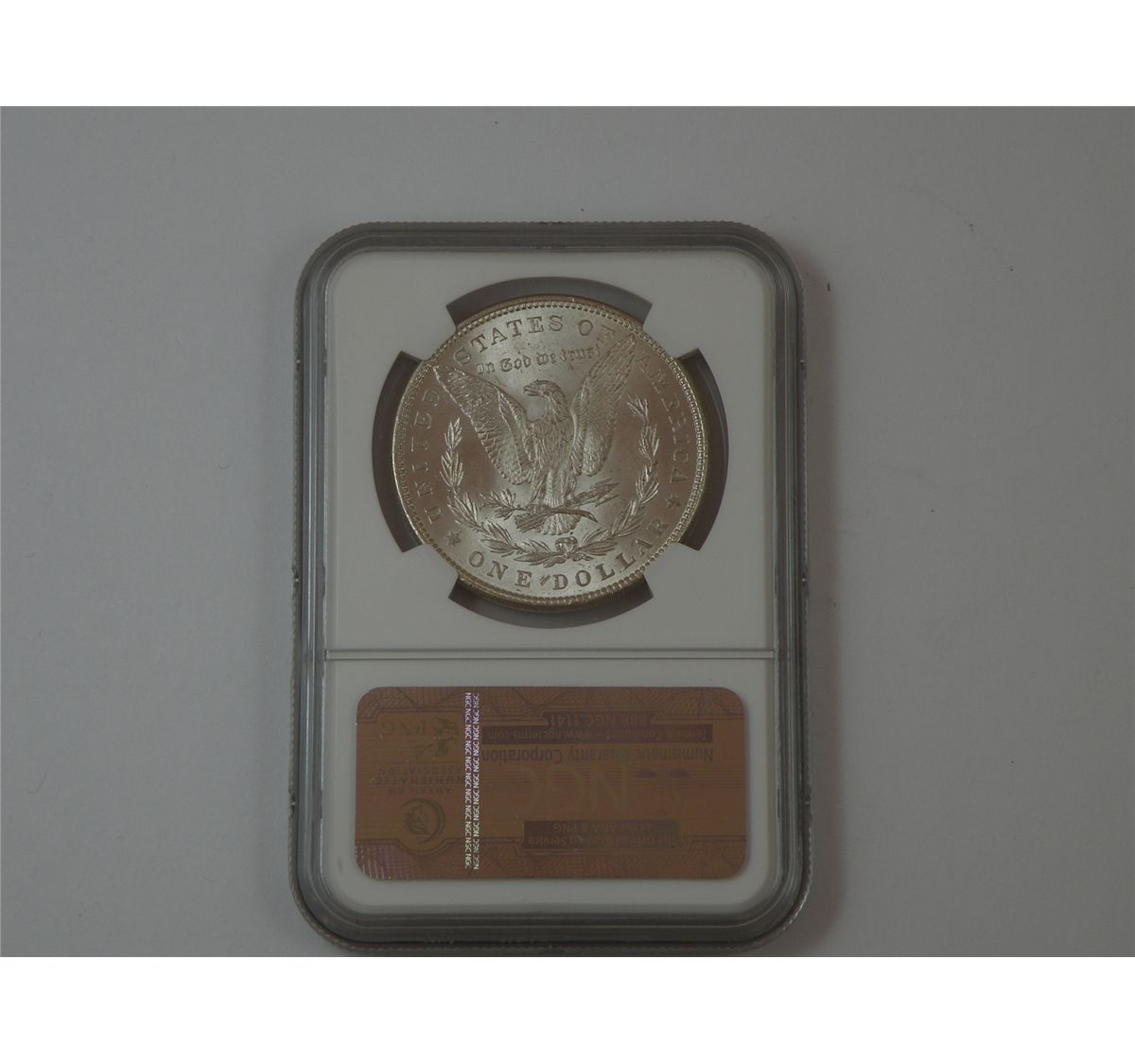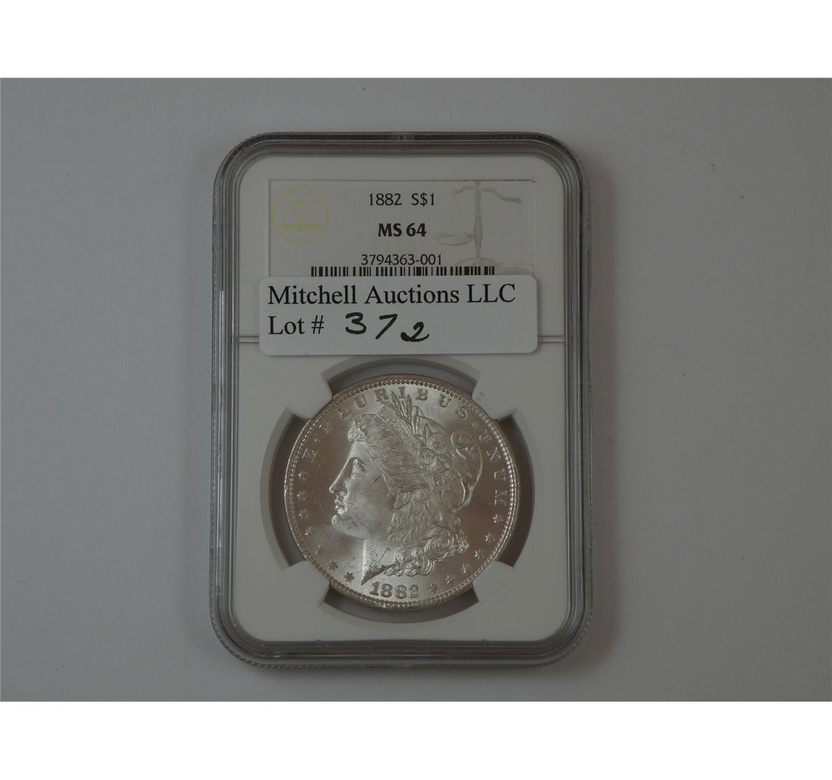 $1 Silver 1882 NGC MS64 and a premium specimen. Silken mint lustre embellishes surfaces that are quite smooth for the grade. Est.$90