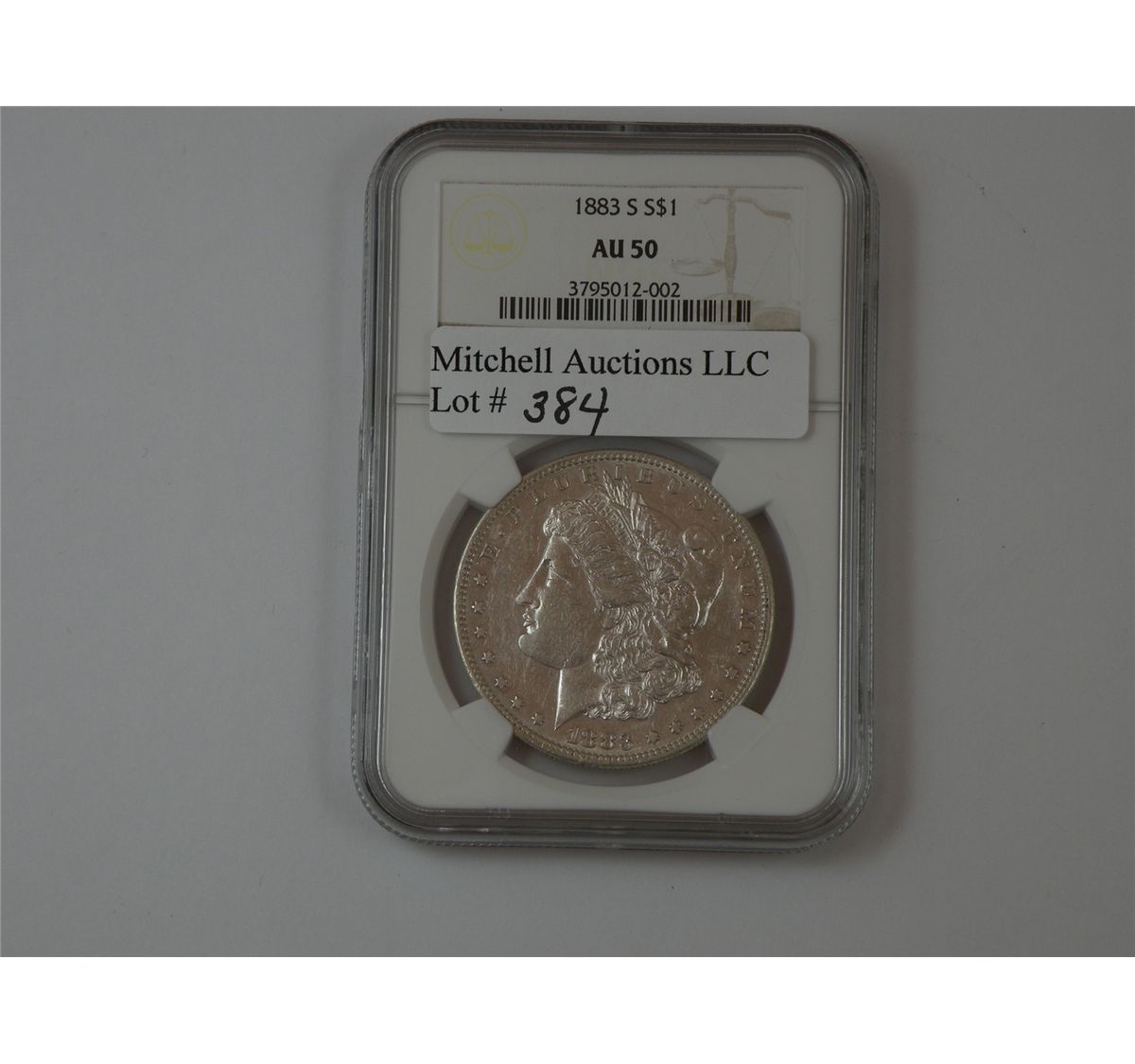 $1 Silver 1883-S NGC AU-50. Bright, frosty and elusive at this grade. Est.$80