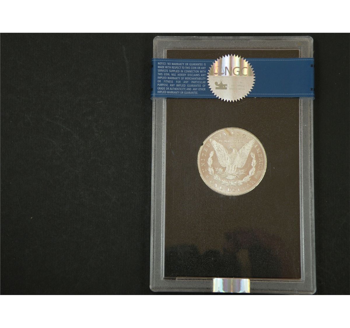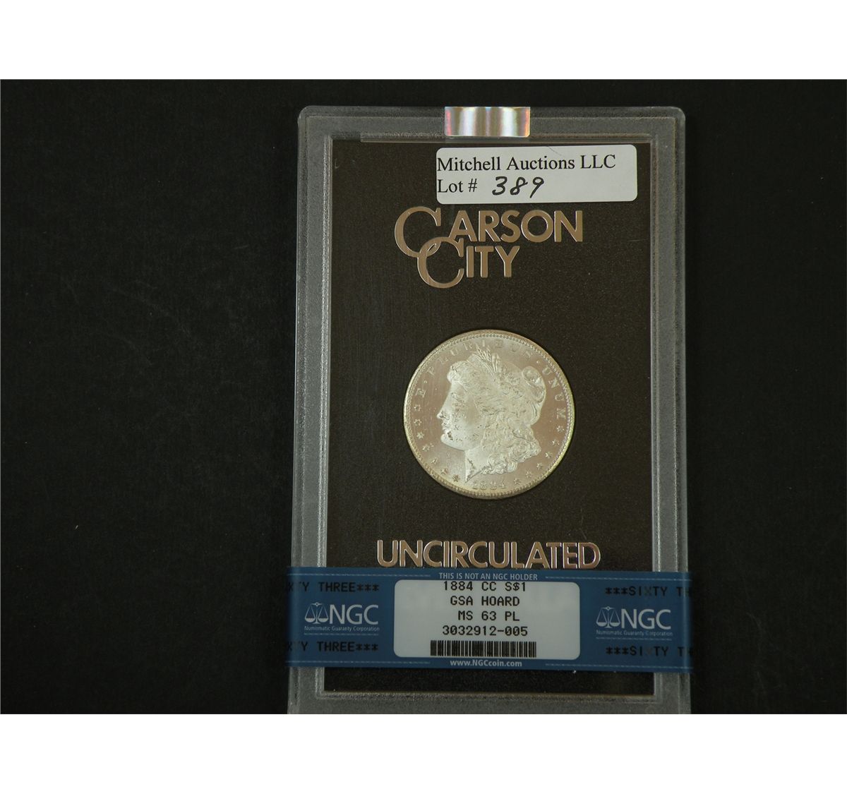 $1 Silver 1884-CC NGC MS63PL, GSA Hoard. Semi-reflective cartwheel bloom embellishes assertive definition. Mounted in a GSA plastic holder. Est.$215