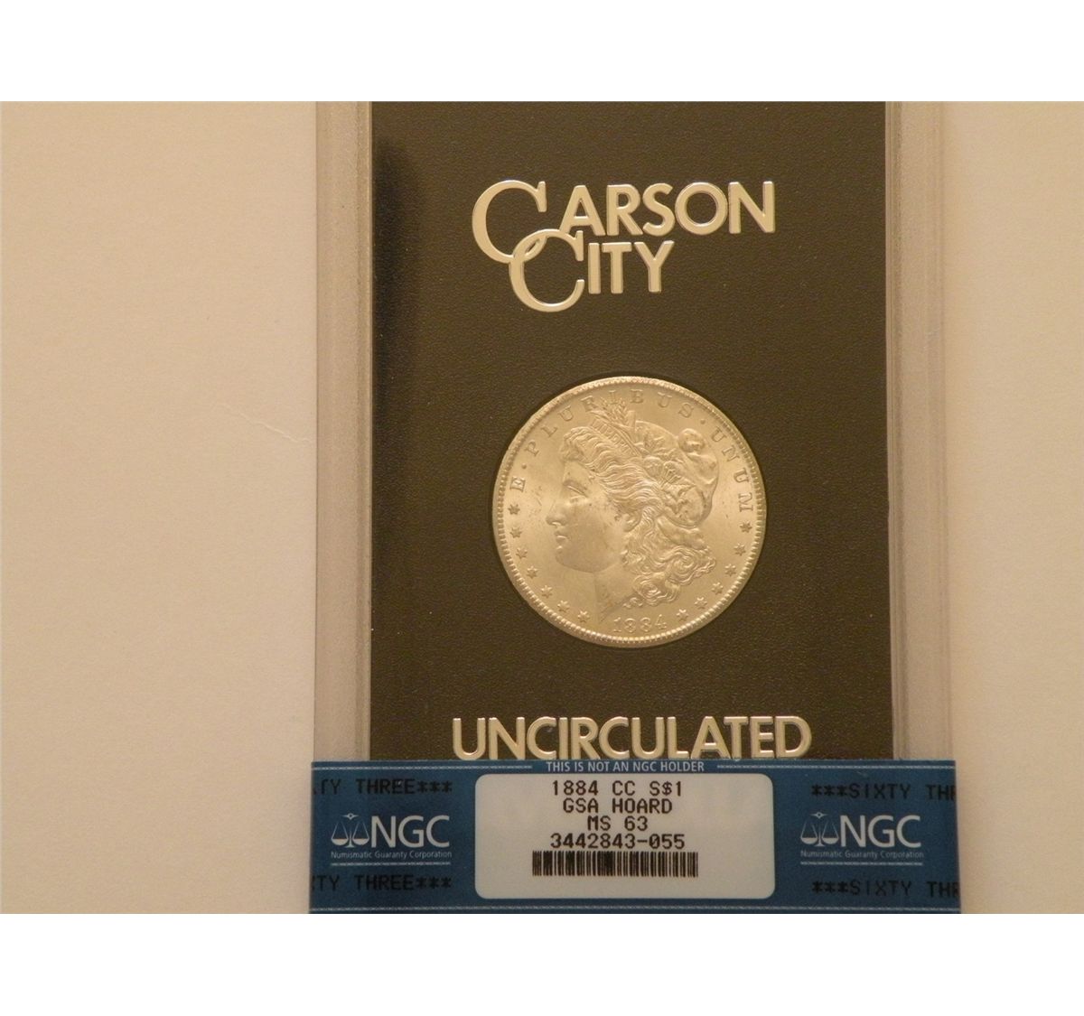 $1 Silver. 1884-CC NGC MS63, GSA Hoard. Rich satin bloom beneath a wisp of lilac- gold. Housed in a GSA holder with box (damaged) and certificate. Est$230
