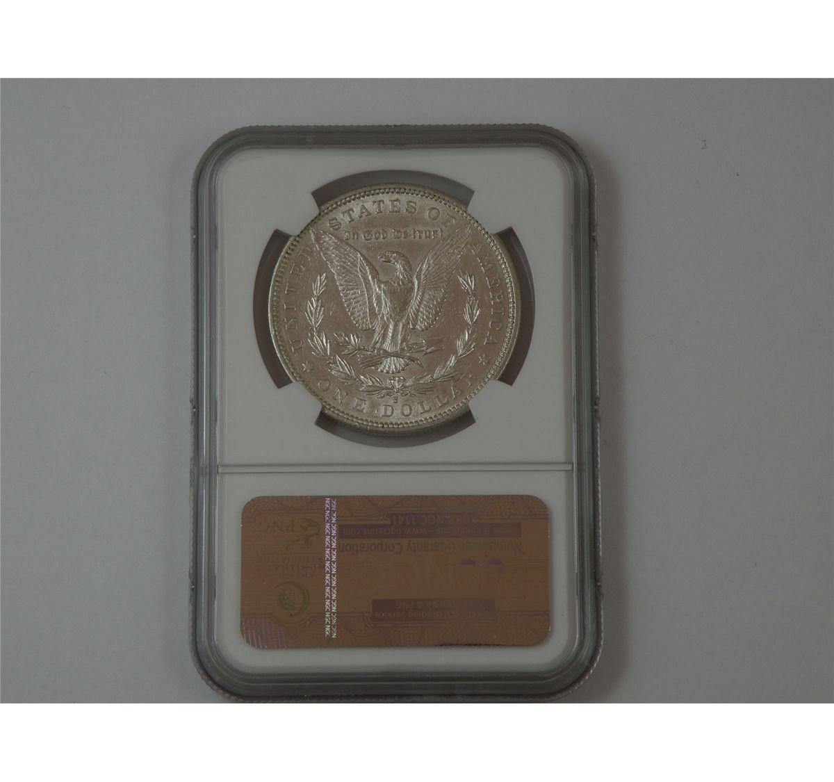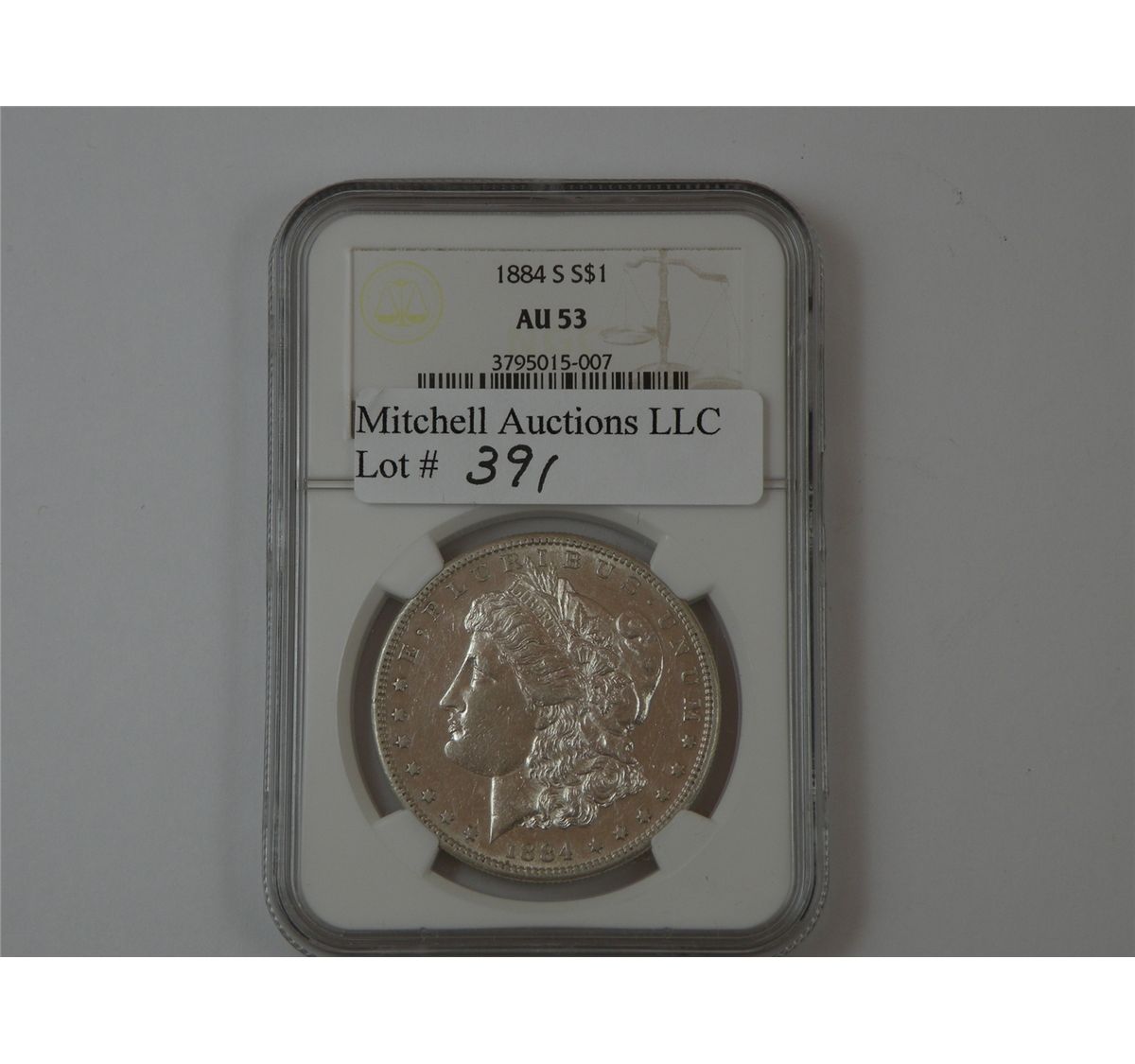 $1 Silver 1884-S NGC AU53. Some shallow facial marks are noted. Bright and frosty. Mint state examples are truly rare and even survivors at the grade level offered here are quite elusive. Est.$200