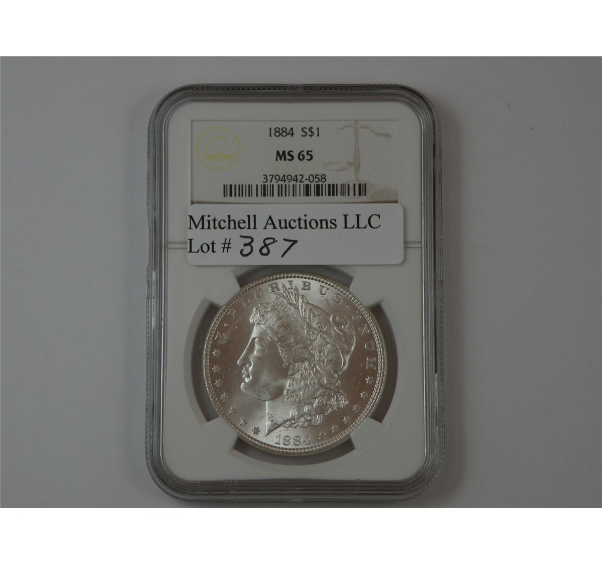 $1 Silver. 1884 NGC MS65. Satiny lustre is highlighted by wispy lavender- golden toning on the reverse. Est.$250