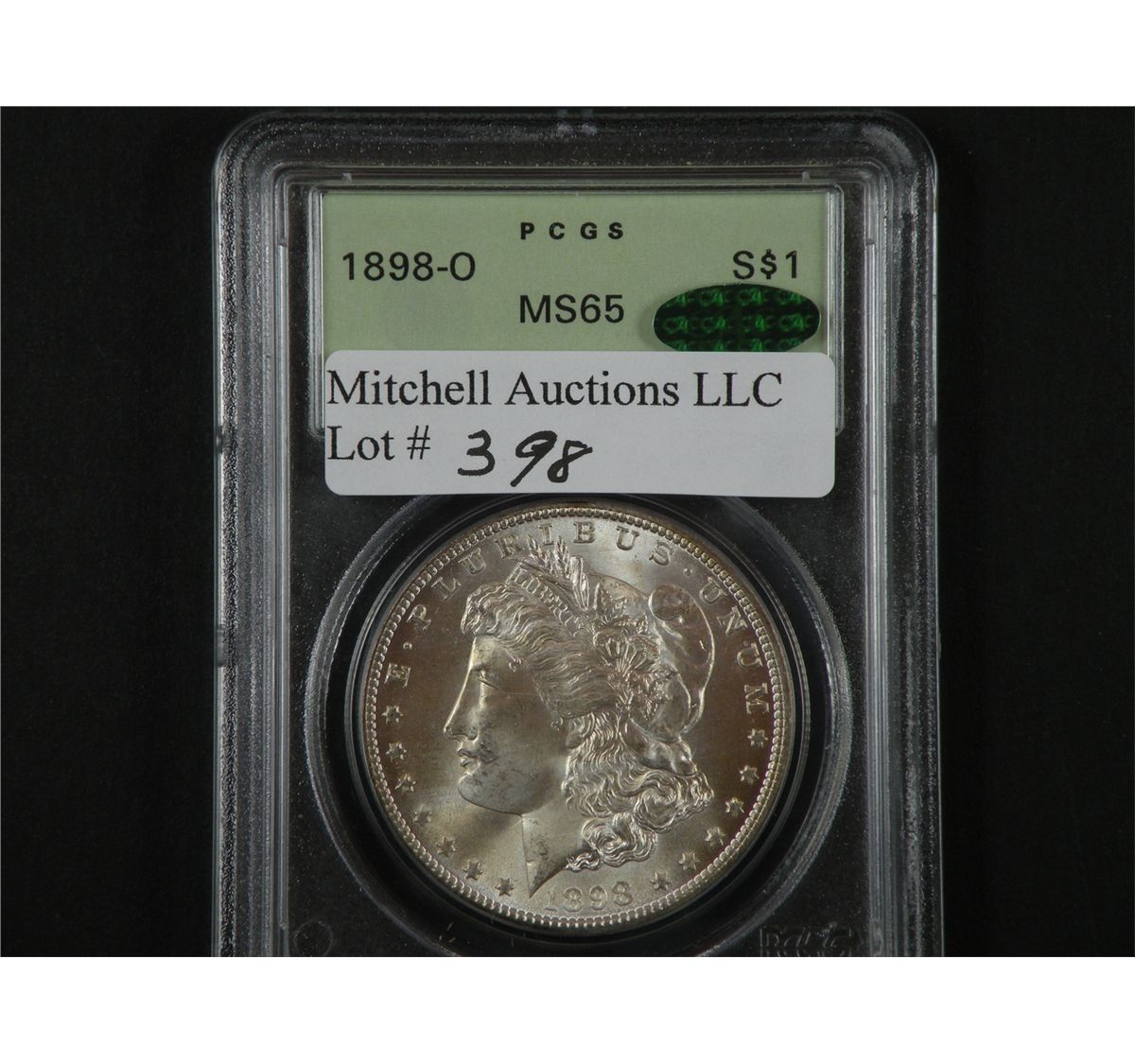 $1 Silver 1898-O PCGS MS65 CAC. This Gem enjoys luxuriant satiny lustre beneath a blush of delicate gold. Encapsulated in an early green insert PCGS holder. Est.$130