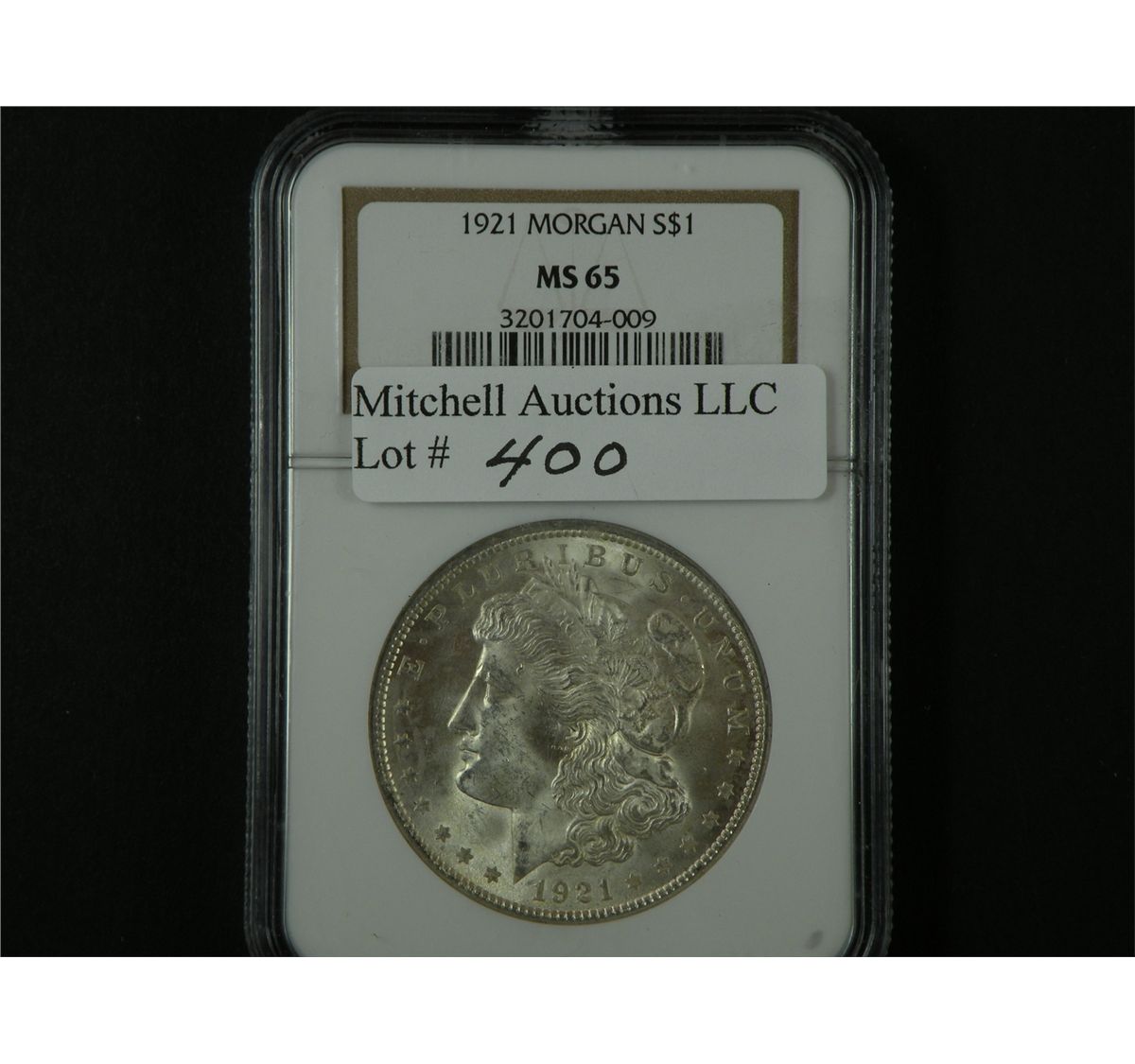 $1 Silver 1921 Morgan. NGC MS65. Wispy toning accents rich underlying satiny lustre. Est.$115