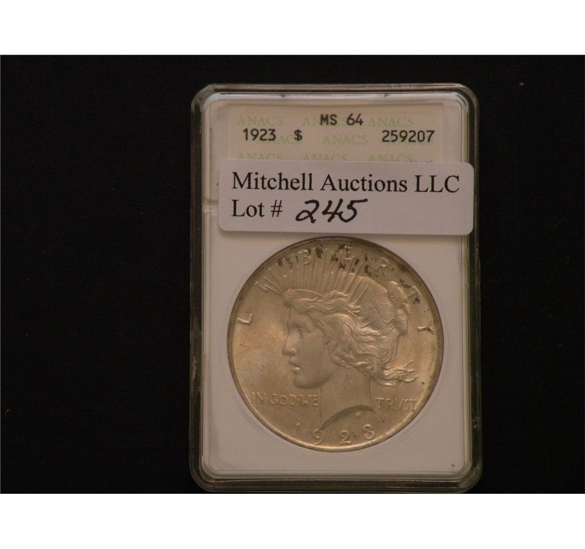 $1 Silver. 1923 ANACS MS64. Wispy shades of gold and mauve over silk- like lustre. A very pleasing coin housed in an early cache holder. Est$50