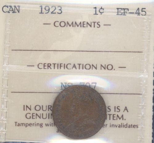 1 Small Cent 1923, ICCS certified EF-45, with traces of luster.