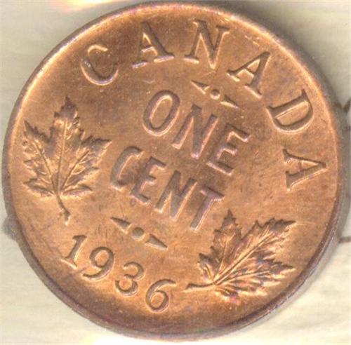 1 Small Cent 1936, ICCS certified MS-63; Red. Lustrous purple red tone.