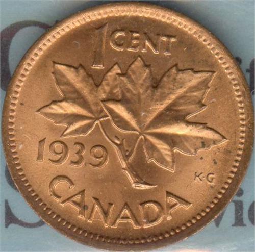 1 Small Cent 1939, CCCS certified MS-65; Red. Gem red coin.