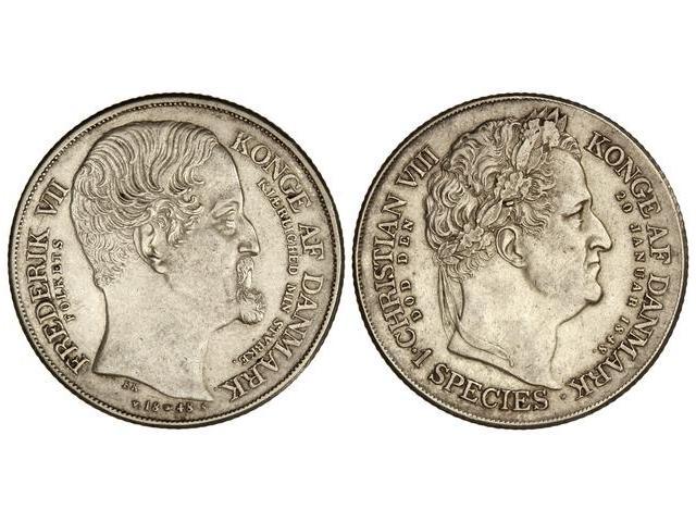 1 Specie Daler. 1848-(c)F.K./V.S. AR. Muerte de Christian VIII y Ascensión de Federico VII. (Leves golpecitos). KM-742. EBC/EBC-.