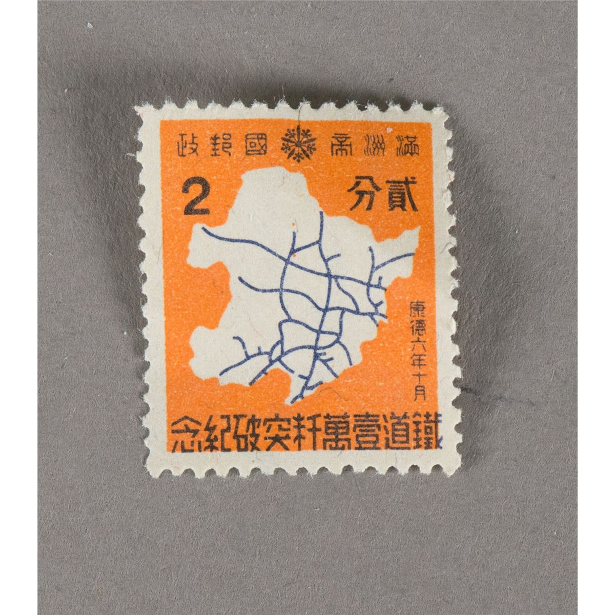 One "2 Cents" Chinese stamp, Man C.9 Completion of 10,000 Km. of Railways (1939.10.21); 18.5 mm x 22.5 mm