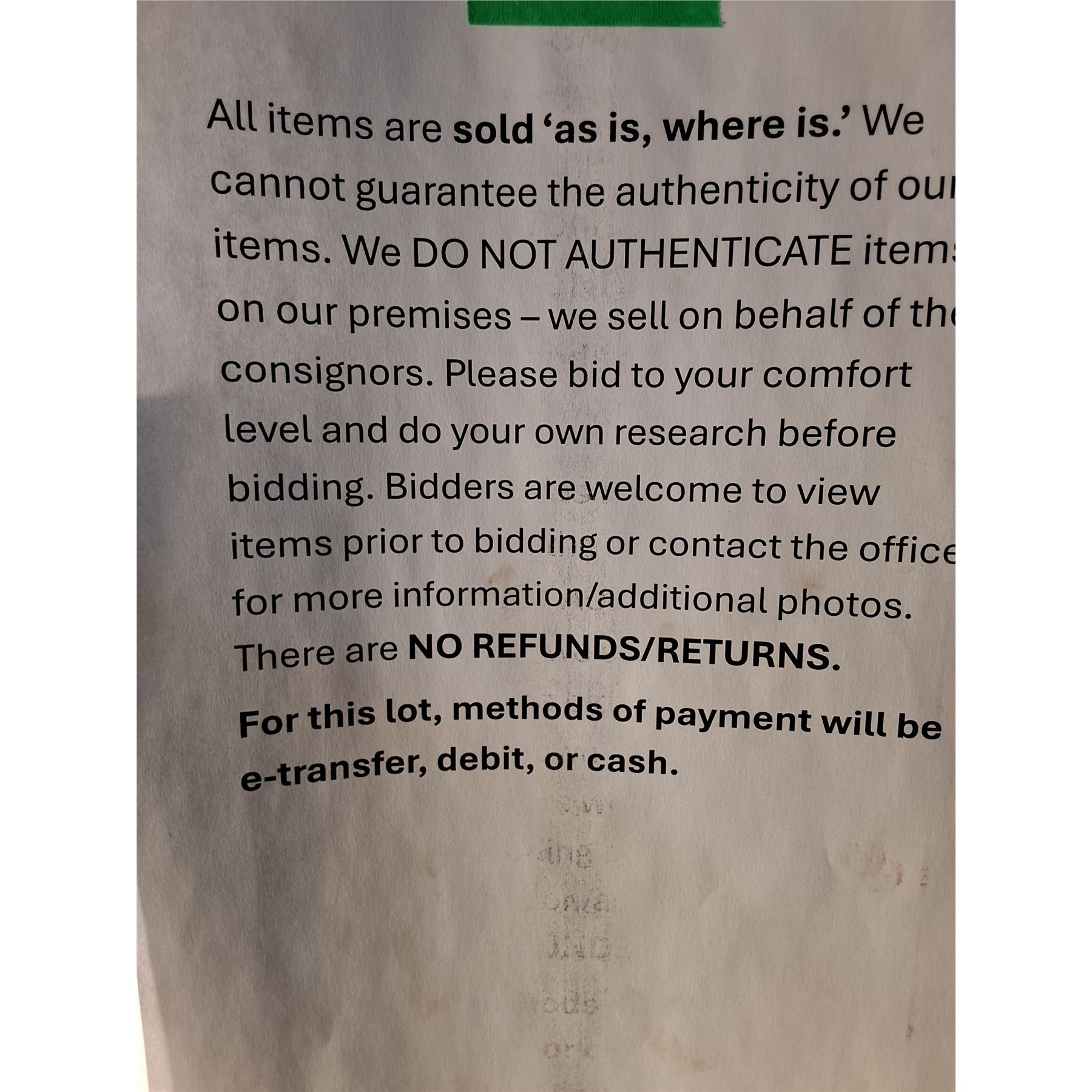 A online bidding premium may be applied to each lot purchased on the Internet. Federal GST and corresponding Provincial Sales Tax will apply to all purchases where applicable.