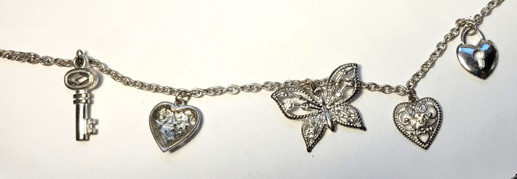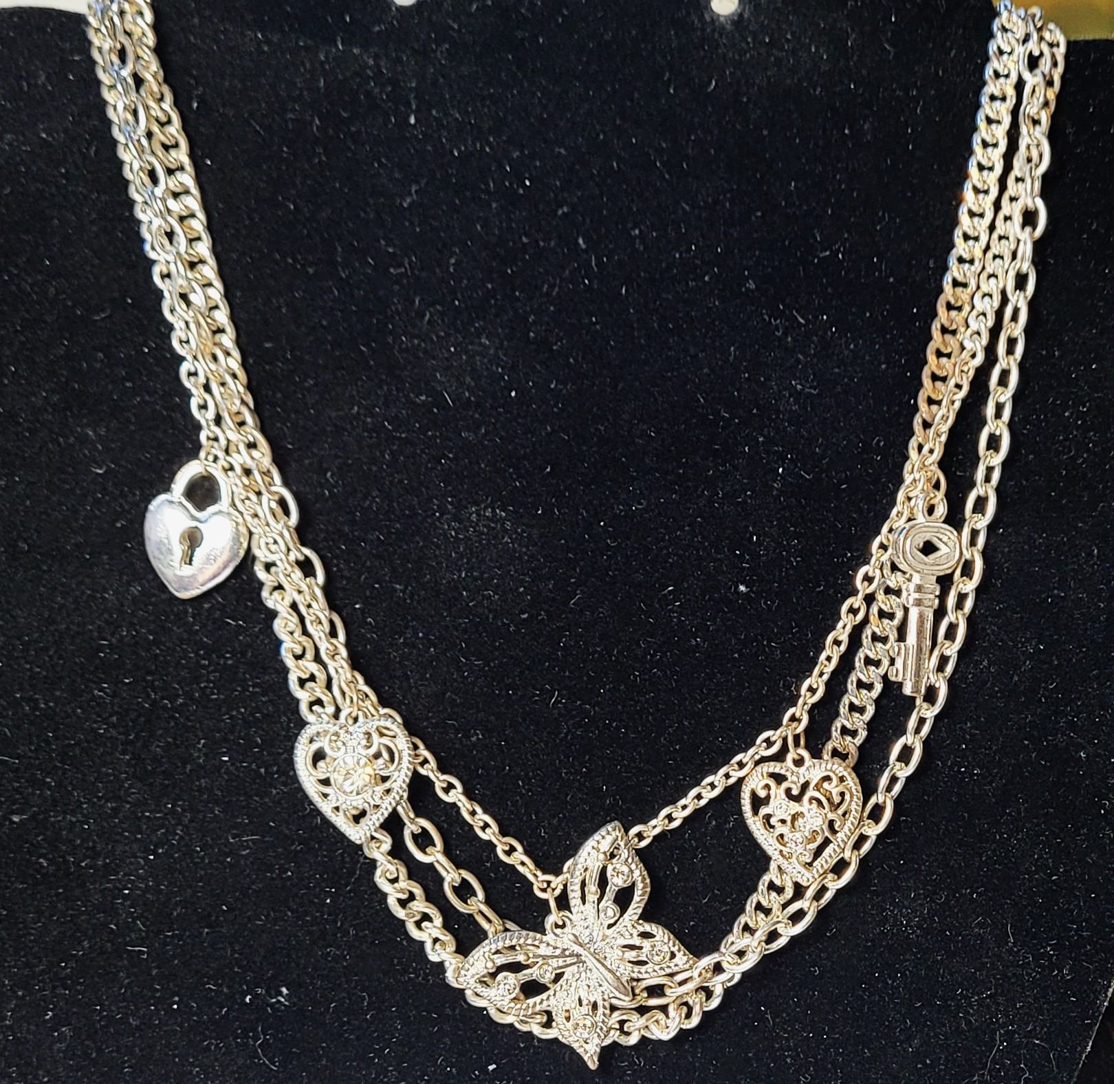 1) TRIPLE STRAND SILVER TONE CHAINS WITH HEARTS,