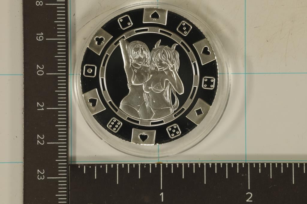 JAPANESE WOMEN ON THE OBVERSE IN BIKINIS HUGGING ONE ANOTHER AND COLORIZED $50 POKER CHIP ON THE REVERSE, IN HARD PLASTIC CAPSULE AND PLASTIC BAG. THIS IS A BRAND NEW ROUND
