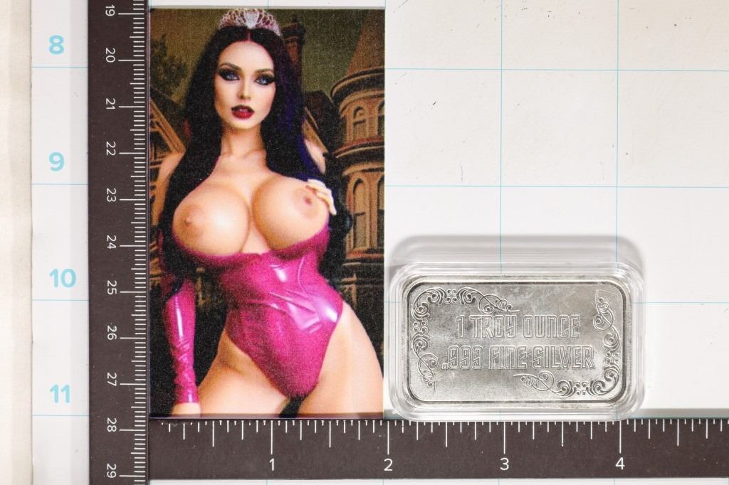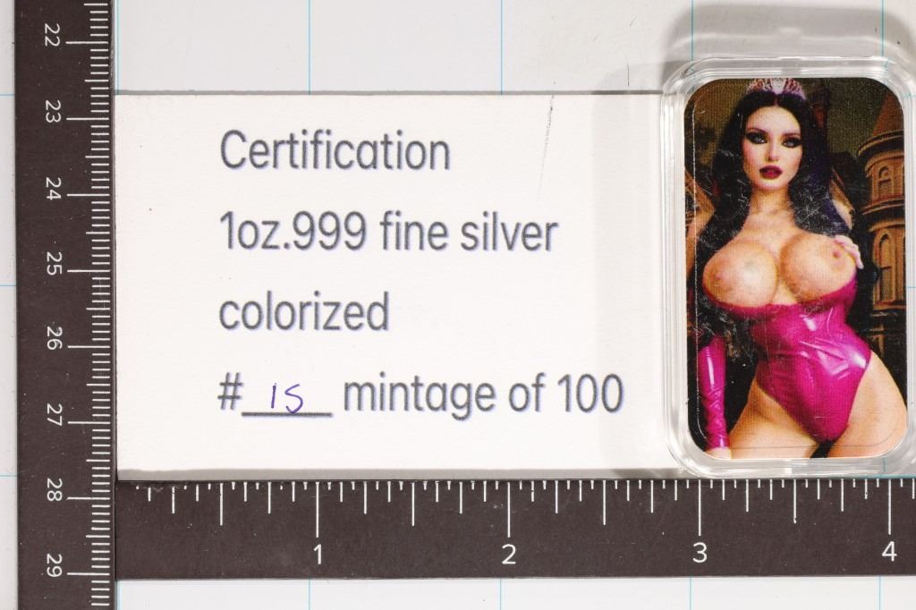 WITH COLORIZED WOMAN ON OBVERSE WITH CHEST STICKING OUT. INCLUDES COLORIZED CERTIFICATE CARD #15 OF 100 IN HARD PLASTIC CAPSULE. INGOT IS BRAND NEW