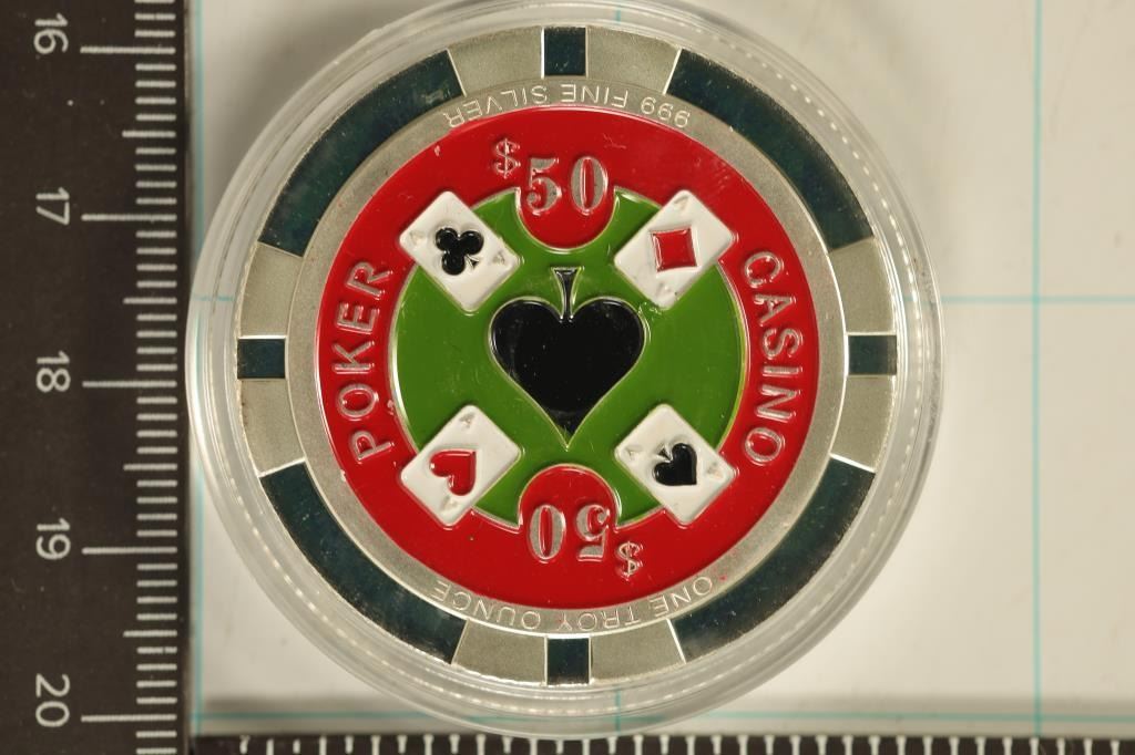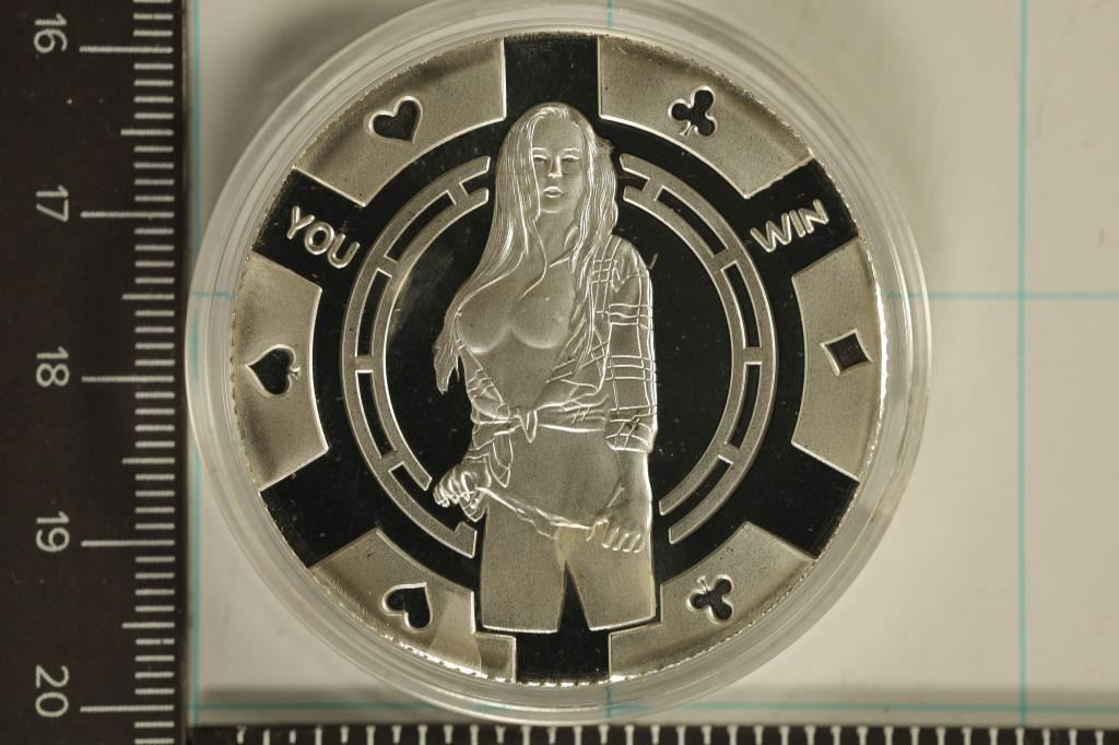 POKER CHIP DESIGN WITH WOMAN ON OBVERSE "YOU WIN" AND COLORIZED CASINO $50 POKER CHIP ON THE REVERSE. BRAND NEW IN HARD PLASTIC CAPSULE AND BAG