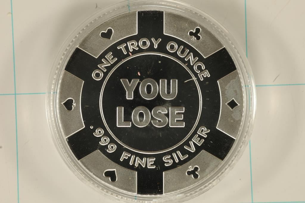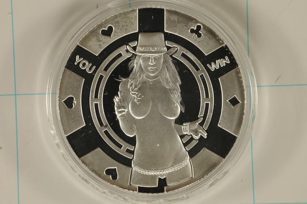 YOU WIN WITH COWGIRL ON OBVERSE AND "YOU LOSE" POKER CHIP DESIGN ON REVERSE. BRAND NEW IN HARD PLASTIC CAPSULE AND BAG. CAPSULE IS CRACKED ON THE EDGE