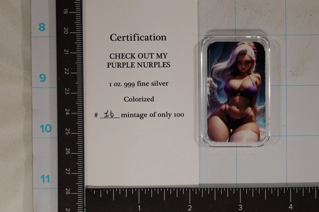 IN SWIMSUIT "CHECK OUT MY PURPLE NURPLES" IN HARD PLASTIC CAPSULE WITH CERTIFICATE, COLORIZED ON OBVERSE, BRAND NEW