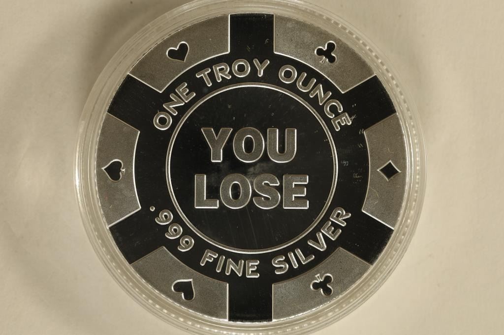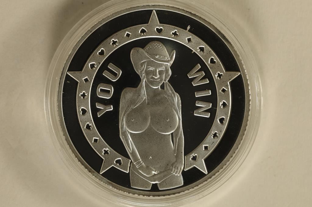 POKER CHIP DESIGN WOMEN ON OBVERSE "YOU WIN" AND "YOU LOSE" ON THE REVERSE. BRAND NEW IN HARD PLASTIC CAPSULE AND BAG.