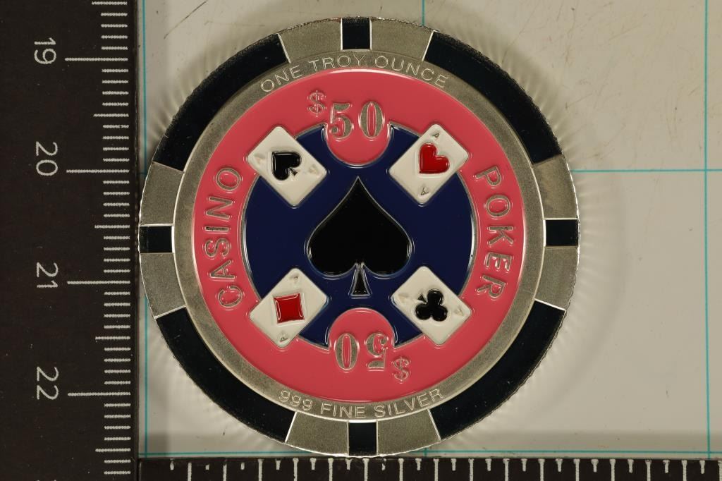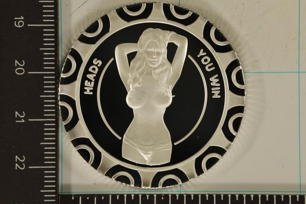WOMAN ON THE OBVERSE "HEADS YOU WIN" AND COLORIZED POKER CHIP DESIGN ON REVERSE $50 CASINO POKER, BRAND NEW IN HARD PLASTIC CAPSULE AND BAG