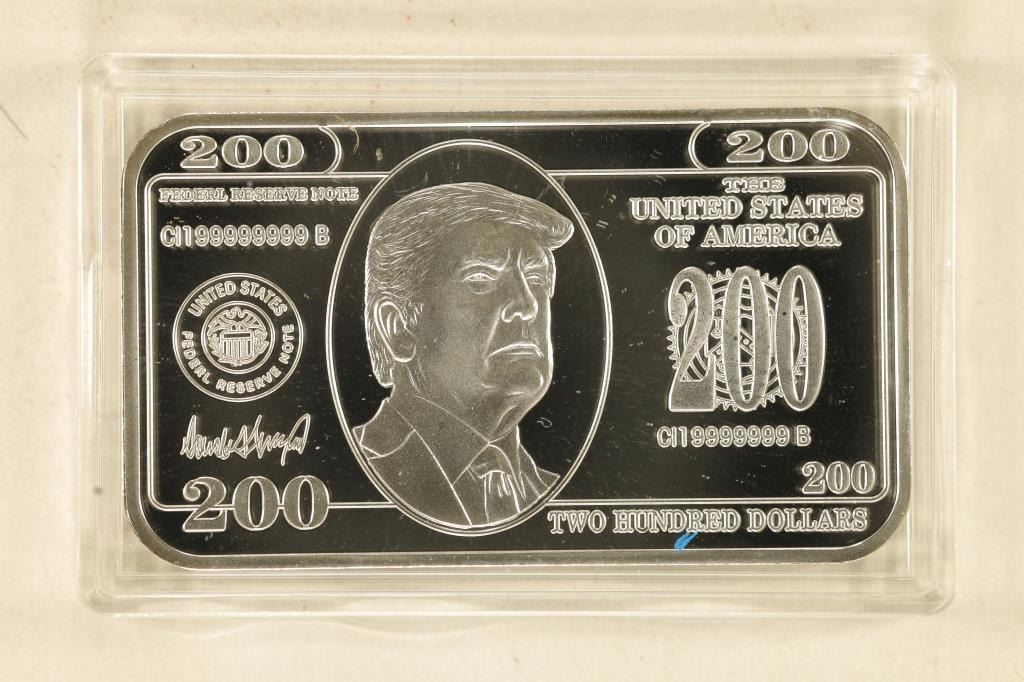 US BILL WITH DONALD TRUMP ON OBVERSE AND REVERSE OF A FANTASY $200 BILL, BRAND NEW IN HARD PLASTIC CAPSULE AND PLASTIC BAG