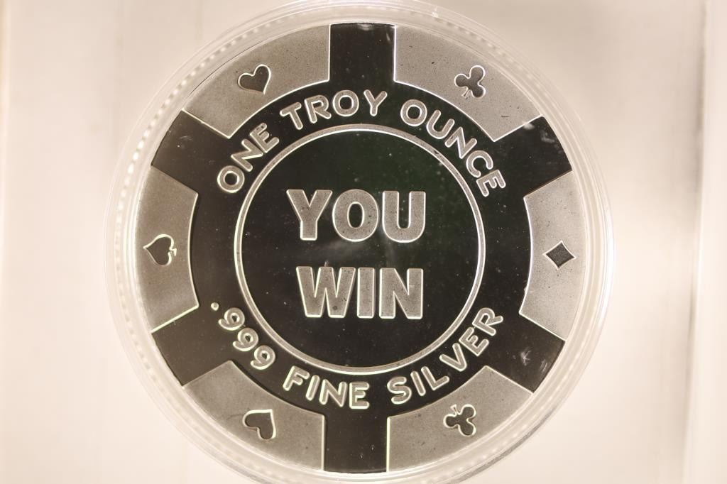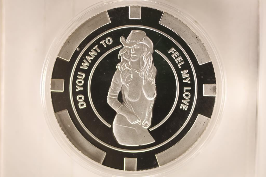 WANT TO FEEL MY LOVE" WITH WOMEN ON OBVERSE AND "YOU WIN" POKER CHIP DESIGN ON REVERSE. BRAND NEW IN HARD PLASTIC CAPSULE AND BAG.