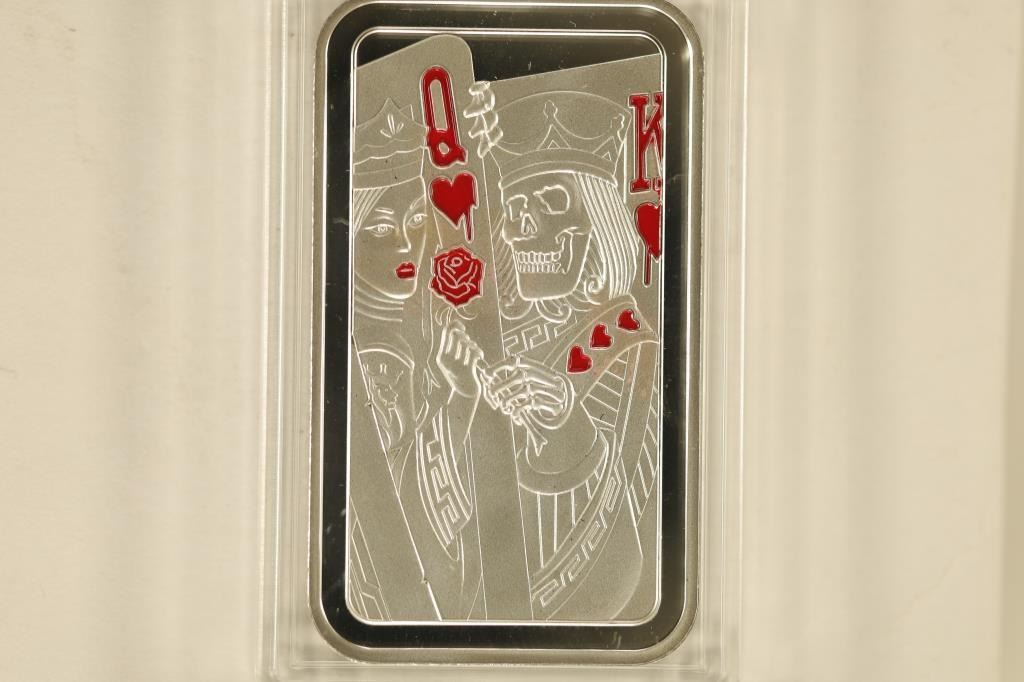 QUEEN OF HEARTS CARD DESIGN. BRAND NEW IN HARD PLASTIC CAPSULE AND BAG.