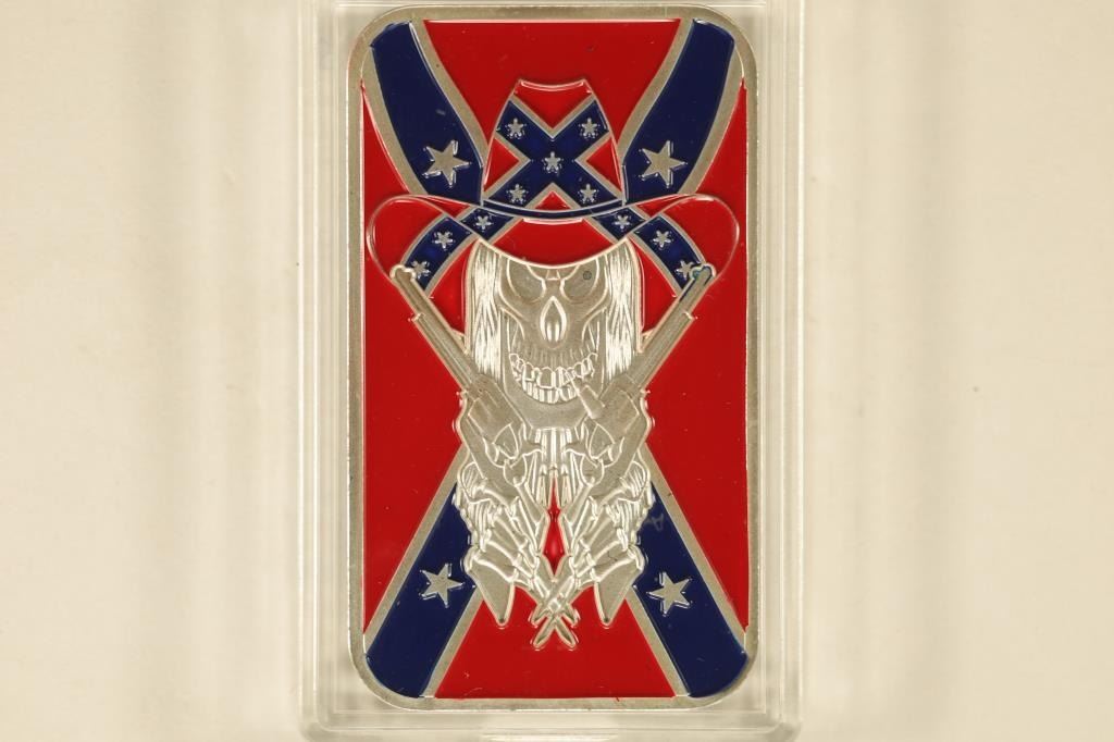 SKULL HOLDING PISTOLS ON THE OBVERSE. COLORIZED, BRAND NEW IN HARD PLASTIC CAPSULE AND BAG.