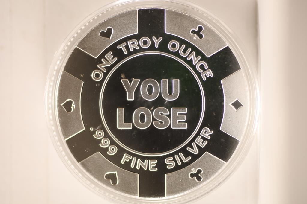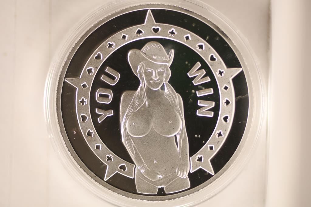 WOMEN THEMED "YOU WIN" ON OBVERSE AND "YOU LOOSE" POKER CHIP DESIGN ON REVERSE. BRAND NEW IN HARD PLASTIC CAPSULE AND BAG.